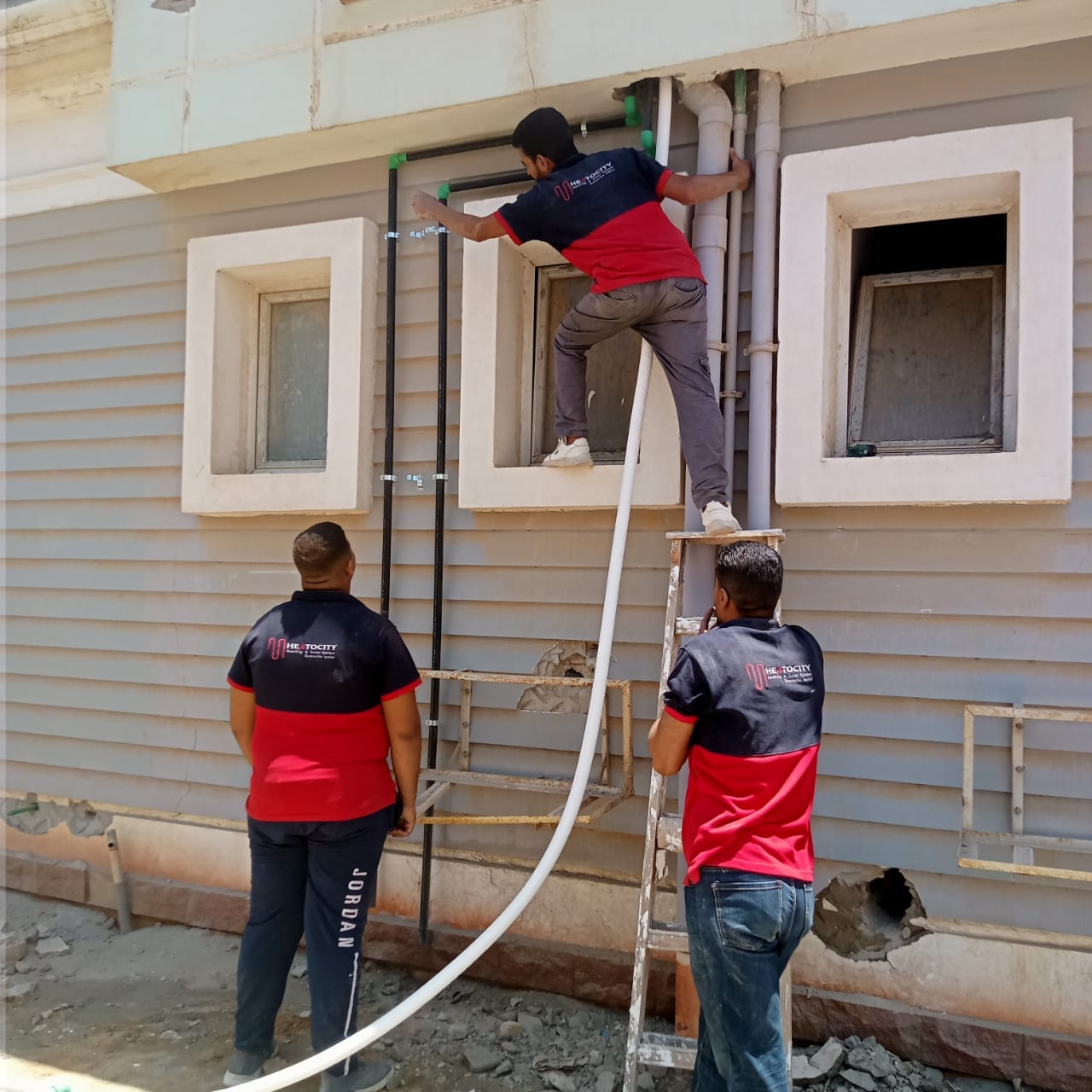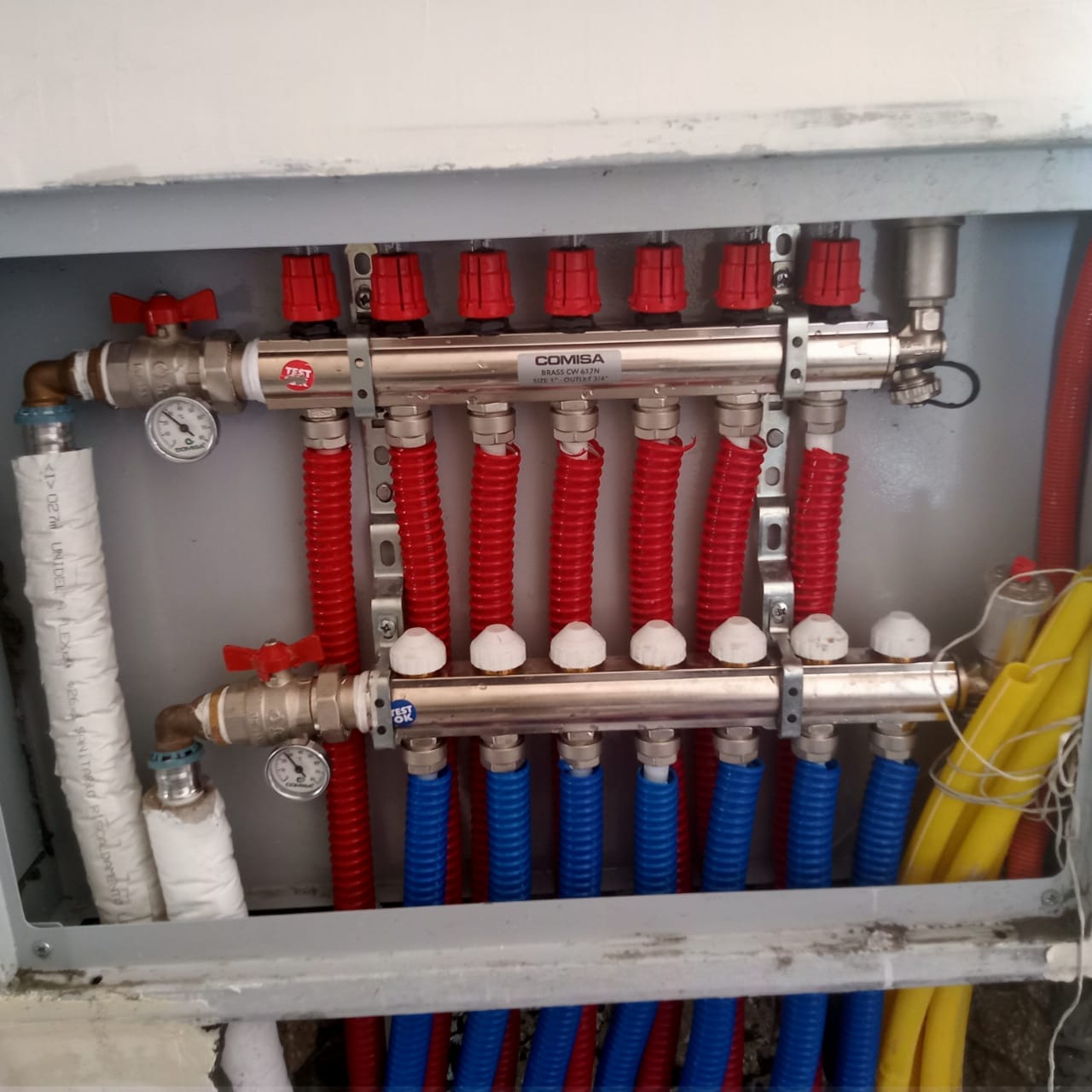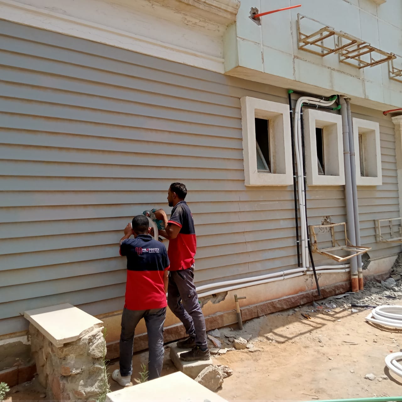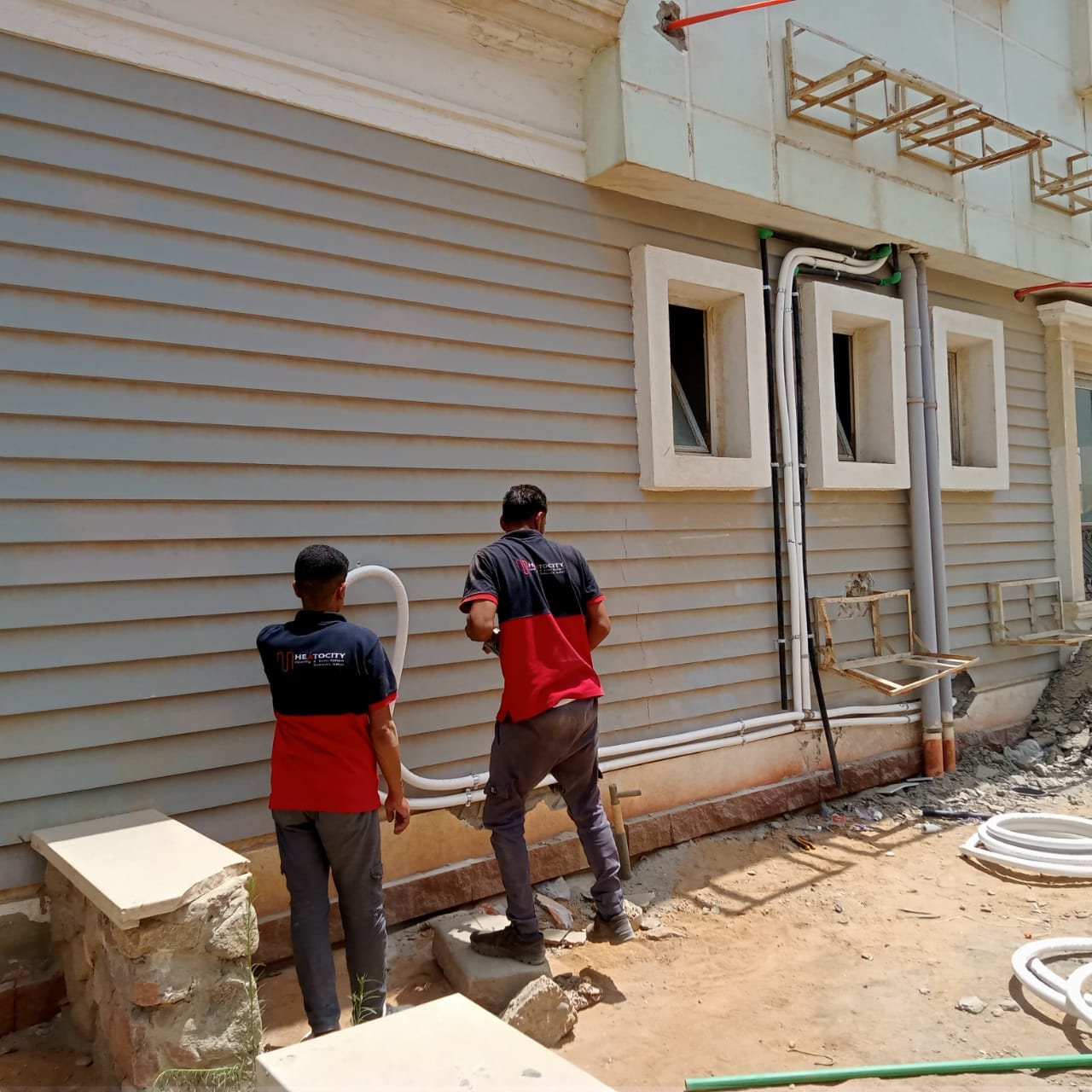 لقد قمنا بتأسيس تدفئة أرضية ( تحت البلاط ) مستخدمين مواسير بيكس ايطالي عالية الجودة واستخدام مادة عازلة وهي الفوم العازل الالومنيوم الحراري لمنع تسرب الحرارة حيث تقوم اولا وقت التأسيس للفيلا بوضع المادة العازلة وبد ذلك إنشاء شبكة المواسير على شكل دائري كما أن نظام التدفئة الأرضي ويشمل هذا المشروع ايضا صواعد البيكس بجميع مشتملاته يتميز بعدة مميزات والتي منها أنه يغطي مساحات كبيرة ويعمل على تدفئة المكان بأكمله كما أنه يوفر في استهلاك الطاقة كما أن النظام لا يحتاج في تركيبه سواء التعامل مع شركة ذات خبرة ولا يحتاج ايضا الى صيانة مستمرة مثل الوسائل التقليدية لذلك هذا النظام هو الأمثل في المؤسسات والفيلات والشقق الكبيرة لأنه يعمل على تدفئة جميع الغرف