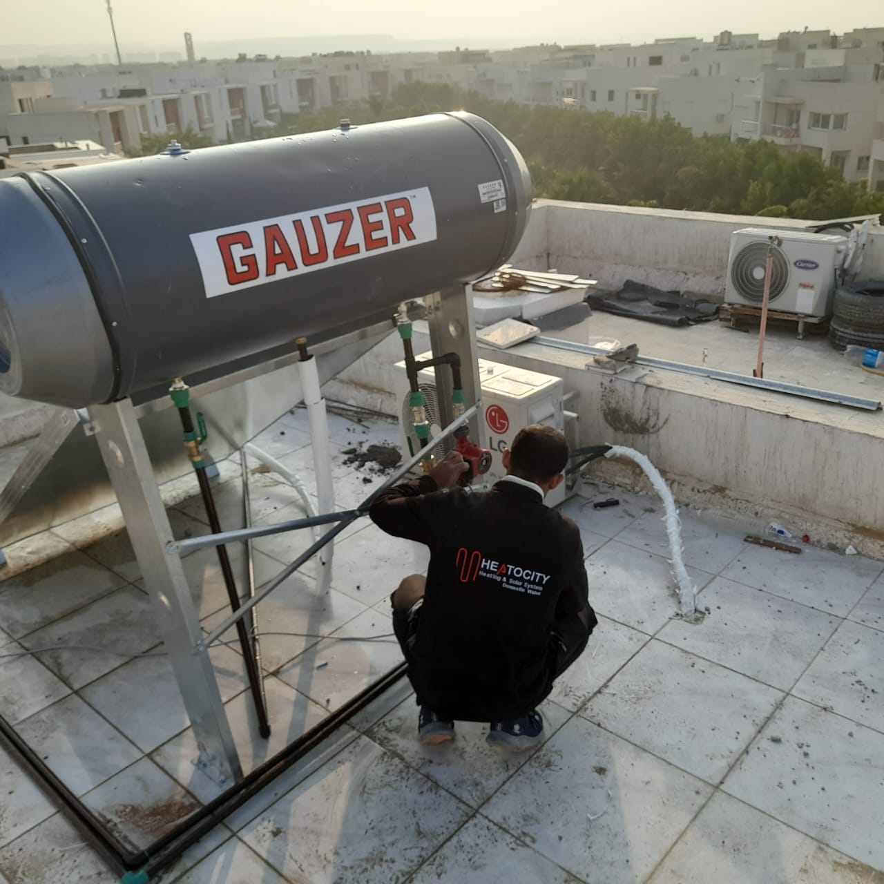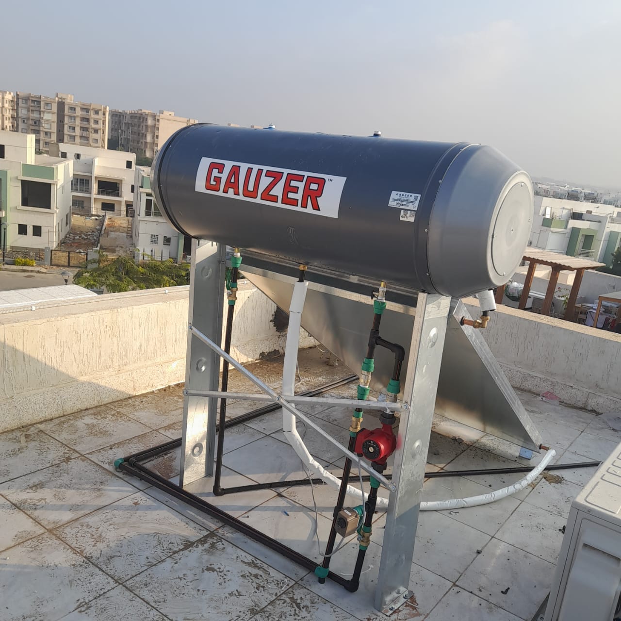 قمنا بتركيب سخان شمسي يوناني بسعه 200 لتر مع ترمبه تقليب باستخدام خامات عالية الجودة فمثلا الألواح الشمسية مكونة من زجاج حراري معالج بسمك 4 مم LIT والسطح الماص من النحاس وجميع اللحامات ليزر مدهون بمادة سيلكتف كما أن الخزان مصنوع من مادة الاستيل مدهون ومعالج بالعزل الحراري سمكه 50 مم تتكون قاعدة السخان من حامل حديد مجلفن مالج بسمك 3 مللي ولسهوله تركيبه فهو مدعم بقطاعات من الألمنيوم كما ان جميع الوصلات من الاستل ستيل بنهاية نحاس معزول عزل حراري